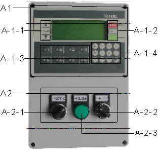 1.A1為PLC顯示屏,初始頁面為公司聯系部分。按下(A-1-1)中的▲▼按鈕調整操作頁面,按第一下▼,第一頁面顯示產量數值,根據畫面提示相對應按鍵(A-1-2)進行設置的數值.當再次按下(A-1-1)中的▼時,此頁面顯示設置下壓和加壓控制時間,根據畫面提示相對應按鍵(A-1-2)及(A-1-4)進行設置數值,單位為毫秒。