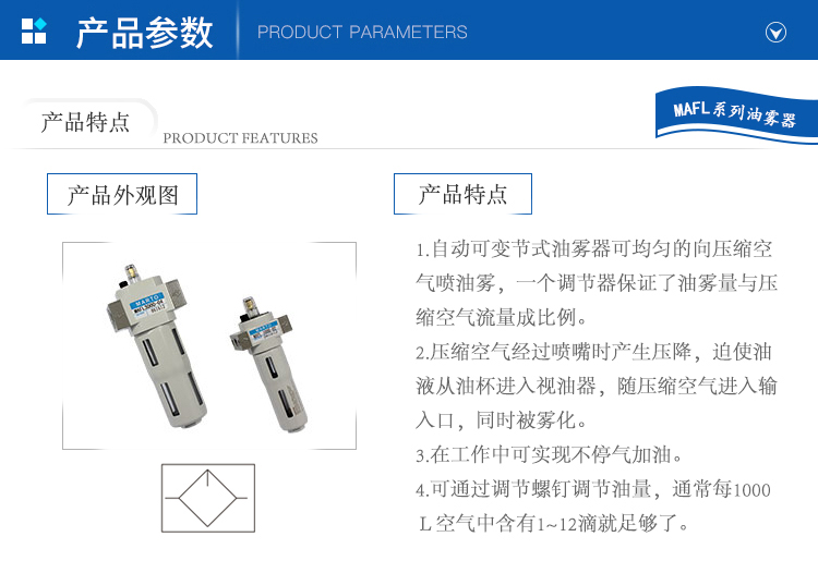 1.自動可變節式油霧器可均勻的向壓縮空氣噴油霧,一個調節器保證了油霧量與壓縮空氣流量成比例。