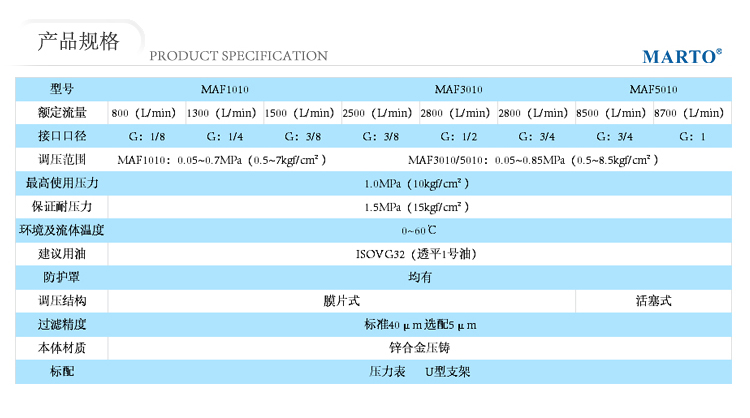 1.過濾減壓閥和油霧器組成的一個單獨的裝置,分水過濾器能過濾空氣中的液態油,冷凝水及雜質,對于特殊應用場合,可更換5μM,40μM的過濾精度濾芯。即使輸入壓力與壓縮空氣消耗產生系統波動,減壓閥也能保主其設定的工作壓力非常穩定。