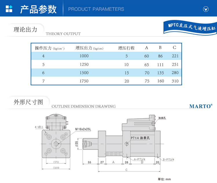 直壓式增壓缸----使用一般氣壓動力源,就能得到油缸的大出力,不需要液壓單元。