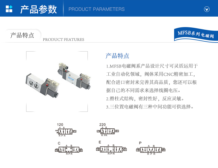 3.三位置電磁閥有三種中間功能可供選擇。