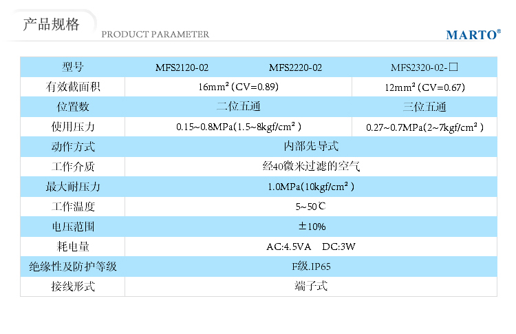 1.MFS電池閥系產品設計尺寸可靈活運用于工業自動化領域,閥體采用CNC精密加工,配合進口密封來完善其高品質,您還可以根據自己的不同需求來選擇線圈電壓。